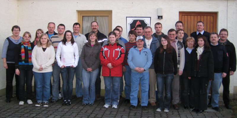 Die erfolgreichen Kursteilnehmer und -teilnehmerinnen der FFW Längenau und der FFW Mühlbach vor dem Feuerwehr-Schulungsraum in Längenau